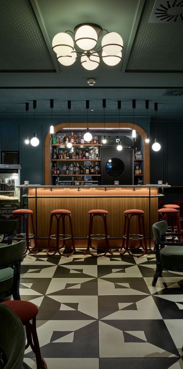 Gestaltung des Barbereichs unter Wahrung der Identität des über 100-jährigen Gebäudes durch eine gezielte Auswahl von Materialien, Farben und Details.