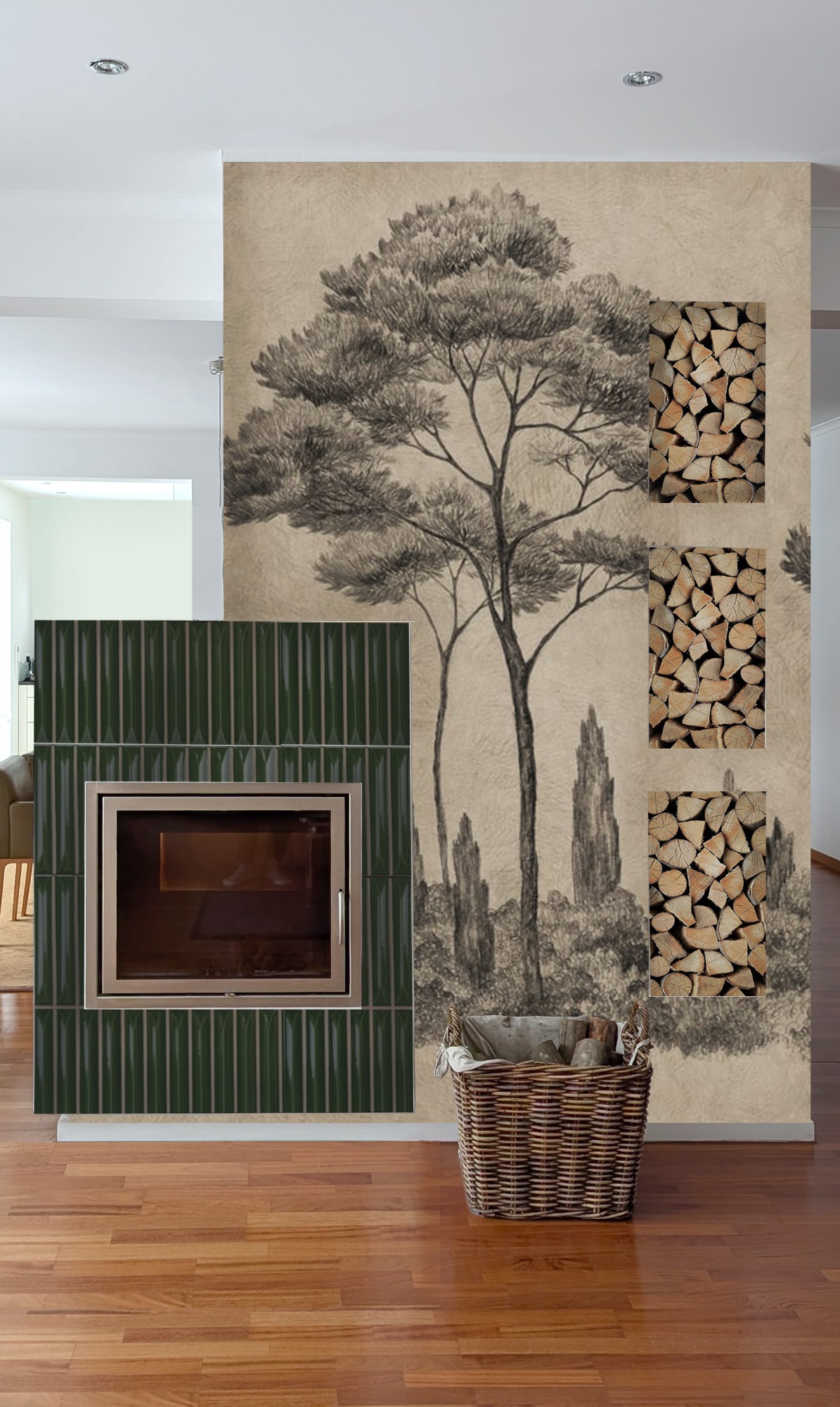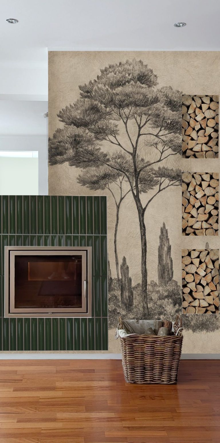Gestaltung des Wohnraums mit besonderem Fokus auf Materialität und Kamin als zentralem Element; natürliche Oberflächen und warme Texturen schaffen eine atmosphärische Verbindung zur umgebenden Natur.